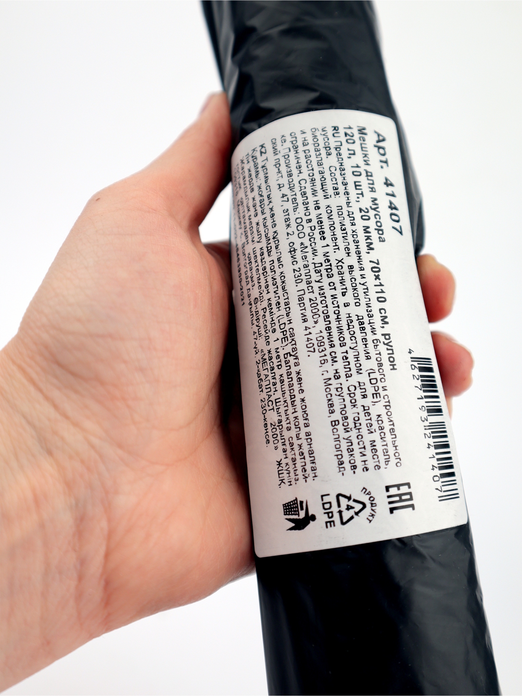 Наклейка содержит всю необходимую информацию (размер, толщину, штрих-код) и, при желании, может поместиться на полке строительных и хозяйственных магазинов. Изготовлены из смешанного полиэтилена (ПНД+ПВД), что существенно улучшает качественные характеристики полиэтилена. Изготовлены с применением биоразлагаемой технологии.