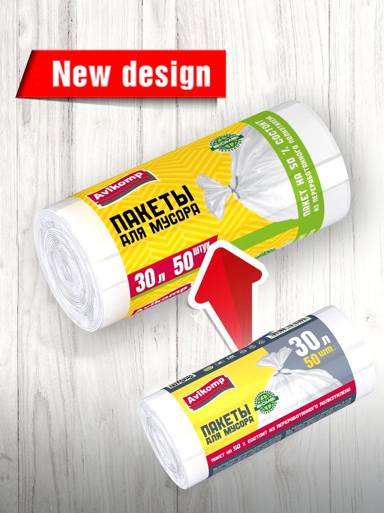 Пакеты изготовлены из смешанного полиэтилена: ПВД (повышает устойчивость к проколам) + ПНД (выдерживает больший вес). На 50 % состоят из переработанного полиэтилена.